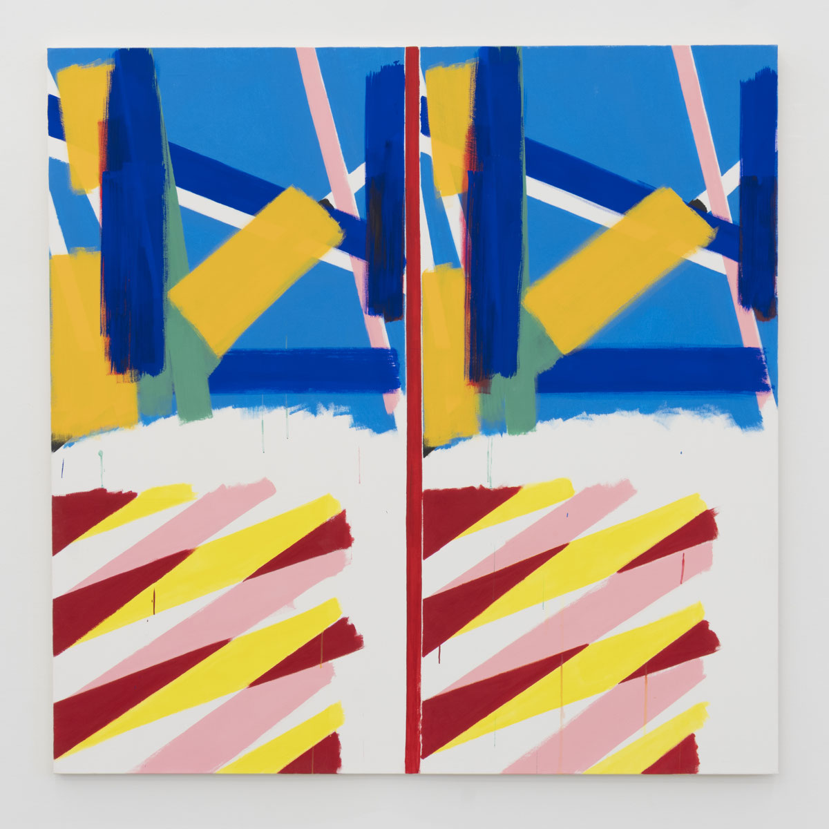 Sur une moitié, le peintre agit librement ; sur l’autre, il répète — à la main, sans calque ni procédé mécanique — le geste initial. Ce redoublement volontaire est une stratégie systématique qui, en annulant l’élan pulsionnel du premier temps, met à distance l’expressivité pour mieux révéler la nature même de la peinture (acry. s. t.259, 2005).