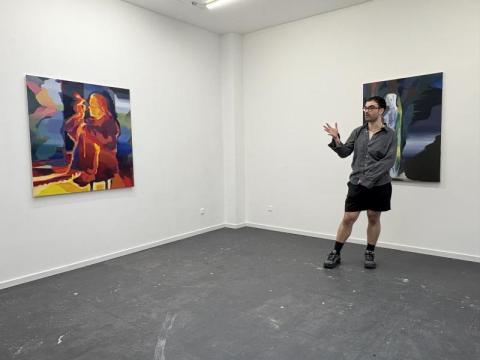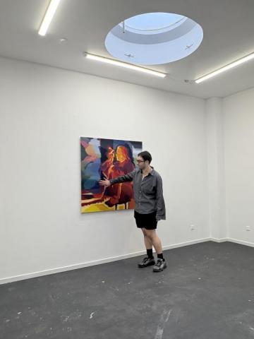 Fusionnant les influences de l'expressionnisme et un intérêt pour l'expressionnisme abstrait, sa pratique explore la répétition et une approche systématique personnelle de la peinture en simplifiant les gestes et les espaces plats en champs colorés et en éléments de composition dans la peinture. Visuel : Pit Riewer Sans titre, 2025 acrylique et huile sur toile, 120 x 120 cm