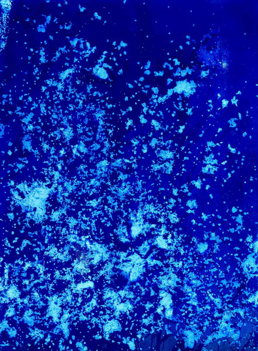 Comme vous le savez, le cyanotype est un procédé photographique ancien qui produit des tirages bleu de Prusse. Cette technique me semble idéale pour mes ambitions artistiques. Mon but n'est pas de réaliser des tirages photographiques, mais d'utiliser cette technique de manière à concrétiser au mieux mes intentions picturales et artistiques. Il en résulte des cyanotypes qui se présentent comme des abstractions uniques, intégrant une composante de matière organique et une surface veloutée. Ces abstractions naissent du mouvement de l'eau et des différentes propriétés minérales des sources d'eau, combinées à la lumière ultraviolette du soleil.