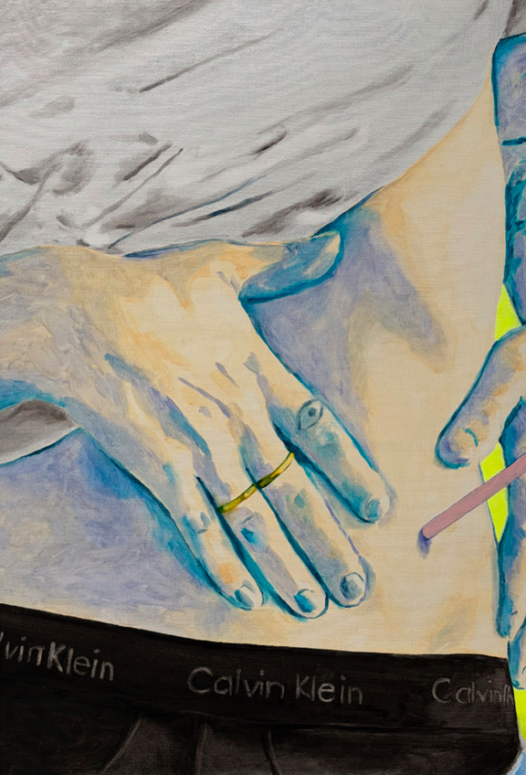 L’artiste ne suit jamais un chemin prédéfini lorsqu’il entame une série. Le choix de Saint Sébastien s’est imposé de manière spontanée, comme une nécessité. Il y trouve un moyen d’exprimer la multitude de sentiments complexes qui traversent l’être lors d’une rupture. La flèche devient alors une métaphore de la blessure émotionnelle, de ce qui nous traverse, tandis que les corps peints agissent comme des réceptacles, des vecteurs d’émotions parfois difficiles à formuler.
